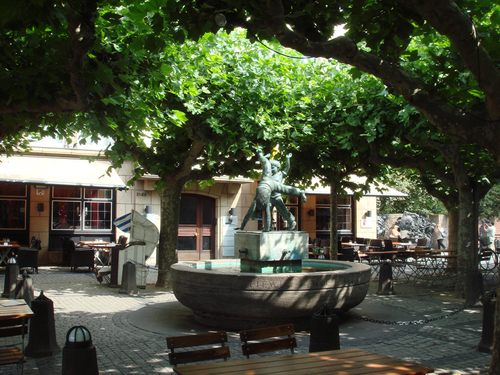 石畳の道を、途中、シューマンの家跡や教会のカフェなどさまさまなところに寄り道しながら、ライン川の見える大きな広場、Burgpl.にたどりつくと、フランスフェアをやっていました。テントがたくさん出ています。