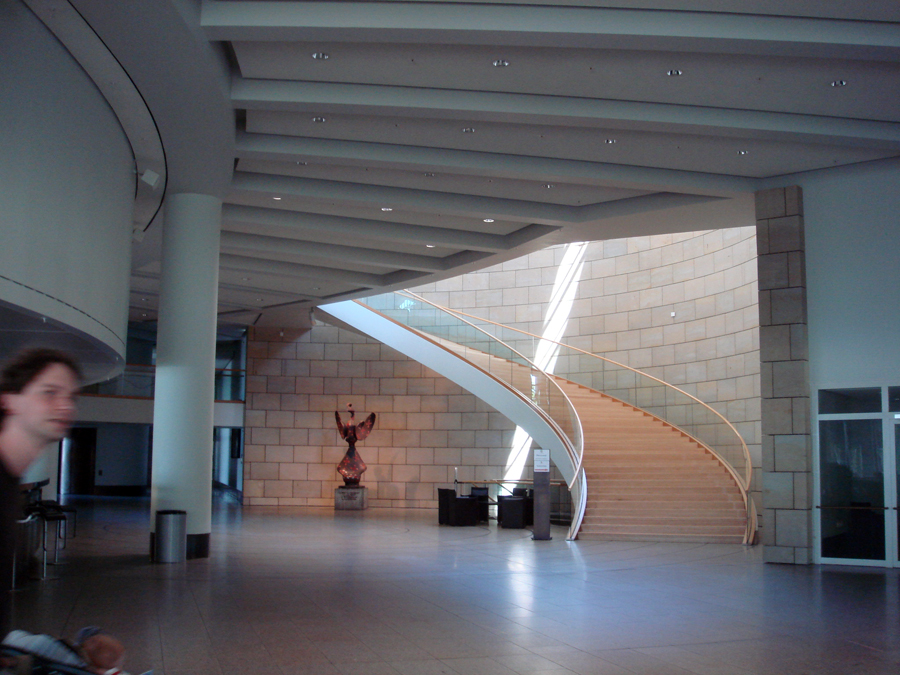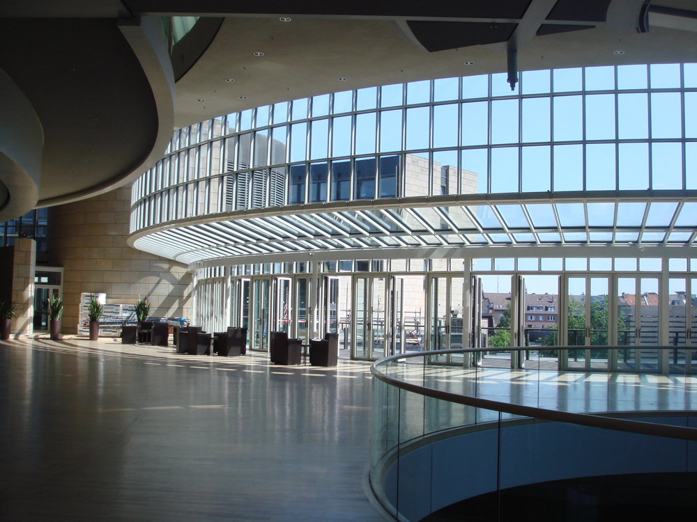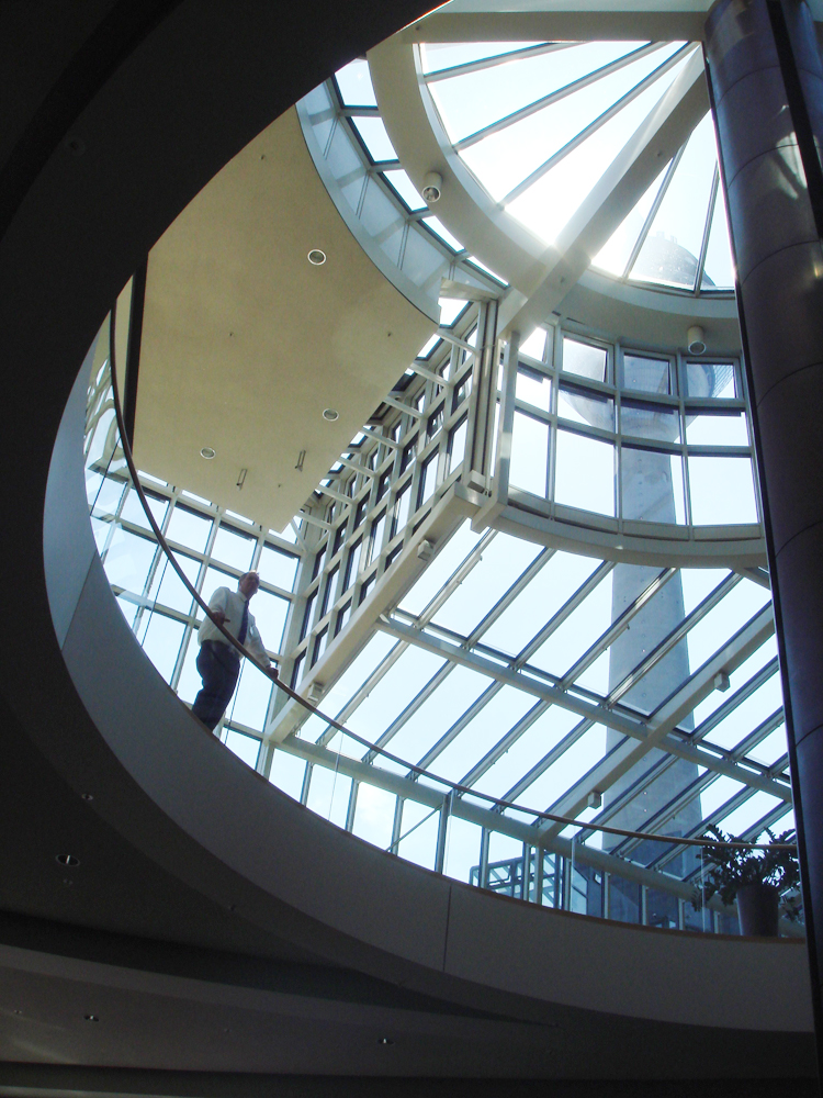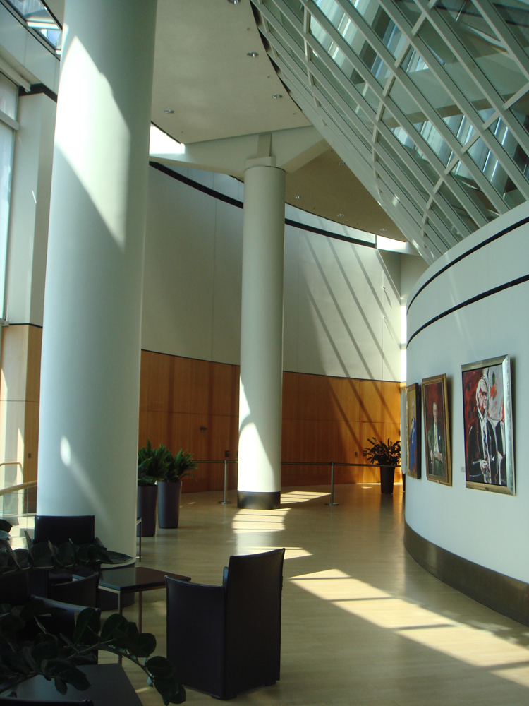 議会場の前のホワイエは、ガラスが多くて明るい空間。