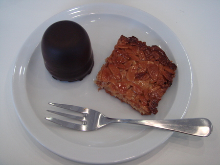 スライスアーモンドが載ったケーキ: Kuchen フロレンティーナとマシュマロの周りにチョコレートがかかったSchokoküsseでした。