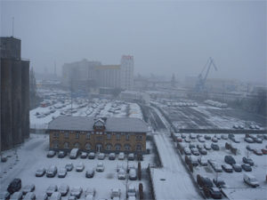 ビルの入り口のクリスマスツリーにも雪が積もり、待ち望んでいた風景を既に見る事ができました。