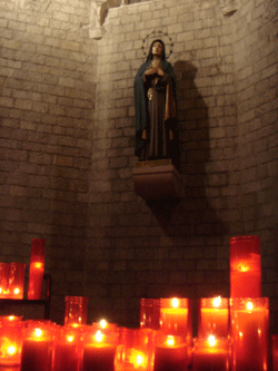 赤や青、緑などの容器に入ったろうそくにどの教会でも火が灯されていますが、赤のろうそくがステンドグラスのように石の壁に映えていました。