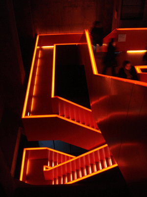 そして、入り口から炭鉱労働者:Minerが潜って行くように、各展示のある21m、17m、12mのレベルまで、暗闇の中でオレンジ色に光る階段を下っていきます。