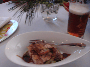 展示を見てから再び、パーティー会場へ戻ると、既にビュッフェ形式で供されていた寿司はなくなっていましたが、トレイで運ばれてくる温かい食事は、おいしいと評判のNRW-Forumのcafeでつくられているだけあり、見た目も麗しく美味でした。