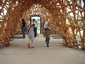 ライン川沿いの、さくらんぼを植栽し、シーズンにはさくらんぼを食べることができると用意されたテントや、ガラスで、蜂の巣箱の中を見る事ができるコーナーの周りを蜂がたくさん飛び交っている中を通り過ぎると見えてきたのが、このかご状の建物。