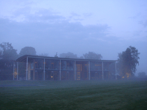 前の道に車を停めて、敷地内に入ると、青々とした芝生の向こうに、玄関側の建物のファサードが見えます。