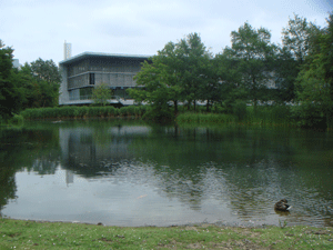 建物は、池に面しており、外装に沿って設けられた長いテラスが学生たちの憩いの場所として人気になっているそうです。